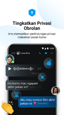 Keamanan dan privasi pengguna juga menjadi prioritas utama di imo. Aplikasi ini menyediakan fitur seperti Mesin Waktu, Pesan Menghilang, Obrolan Privasi, Perlindungan Layar, dan Enkripsi End-to-End untuk meningkatkan privasi obrolan. Pengguna juga dapat mengaktifkan fitur terjemahan pesan instan untuk memudahkan percakapan lintas bahasa, serta berbagi file dengan lancar dan aman melalui fitur Enkripsi End-to-End.