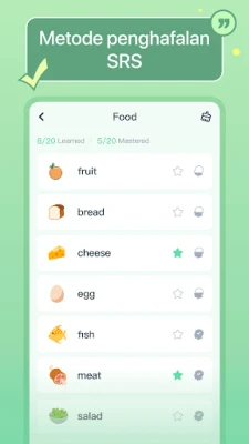 Setelah setiap sesi Anda akan melihat kemajuan harian Anda dengan laporan terperinci dari semua kata yang Anda pelajari, termasuk kata-kata yang sudah Anda kuasai dengan mengklik "Filter senior".