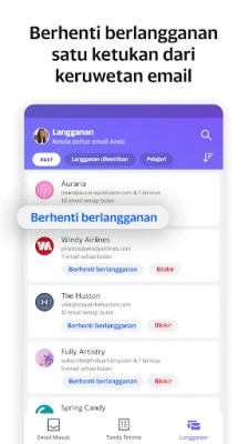 Tak perlu lagi menyipitkan mata mencari tautan berhenti berlangganan yang sangat kecil di bagian akhir email yang panjang. Kami menata semua milis Anda di satu tempat untuk mempermudah berhenti berlangganan buletin dan promo yang terlalu sering dikirim, cukup dengan satu ketukan singkat.