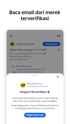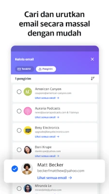 Saatnya membereskan semuanya dengan aplikasi Yahoo Mail – aplikasi email teratas untuk kotak pesan Gmail, Microsoft Outlook, AOL, AT&T, dan Yahoo. Kami punya yang Anda butuhkan, mulai dari kotak pesan yang efektif, penyesuaian tambahan, hingga filter kotak masuk yang otomatis menata email Anda berdasarkan kategori.